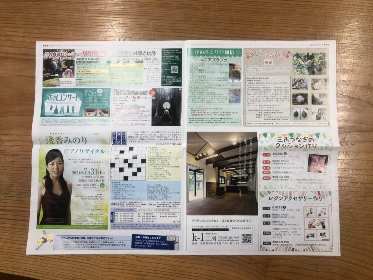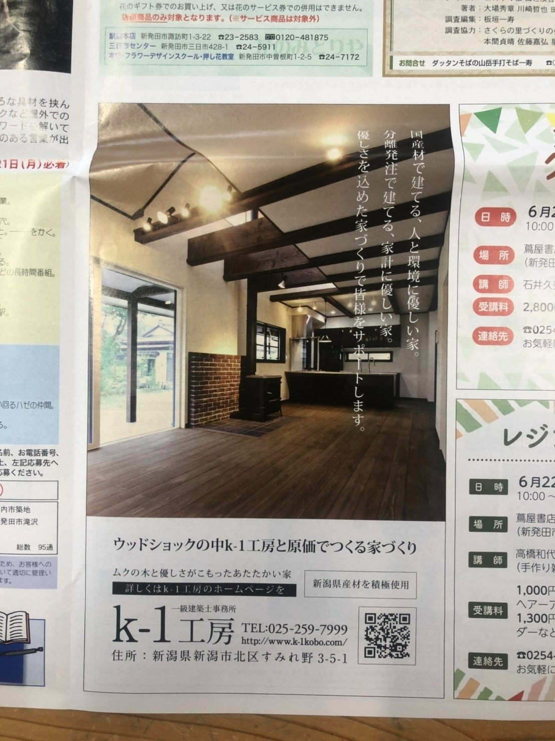 メディア掲載情報|minicに掲載いただきました 新発田市で発行している新潟日報さんのminicに掲載させていただきました。 誌面はこんな感じで、地域に密着した情報が掲載されています。 k-1工房の広告です。 ウッドショックで家づくりがうまく進んでいない方はお気軽にご連絡下さい!