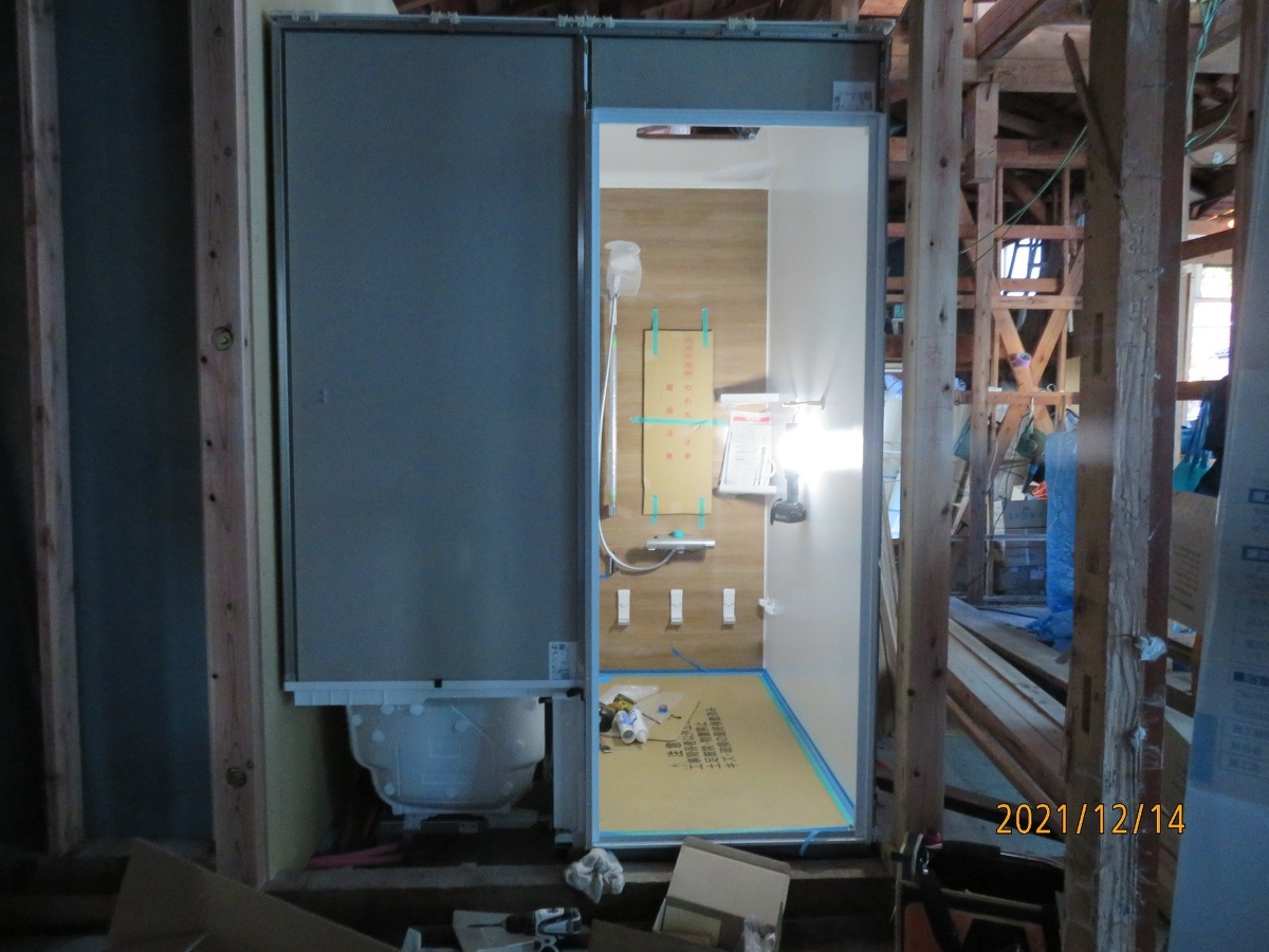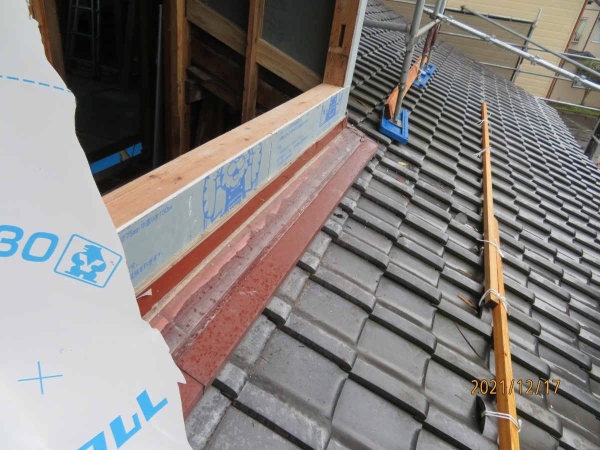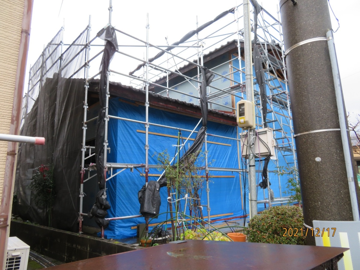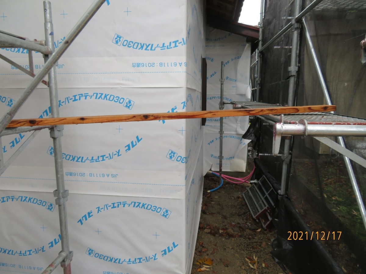 補強工事(梁・柱の入れ替え)や外壁下地組みなどが完了しました。