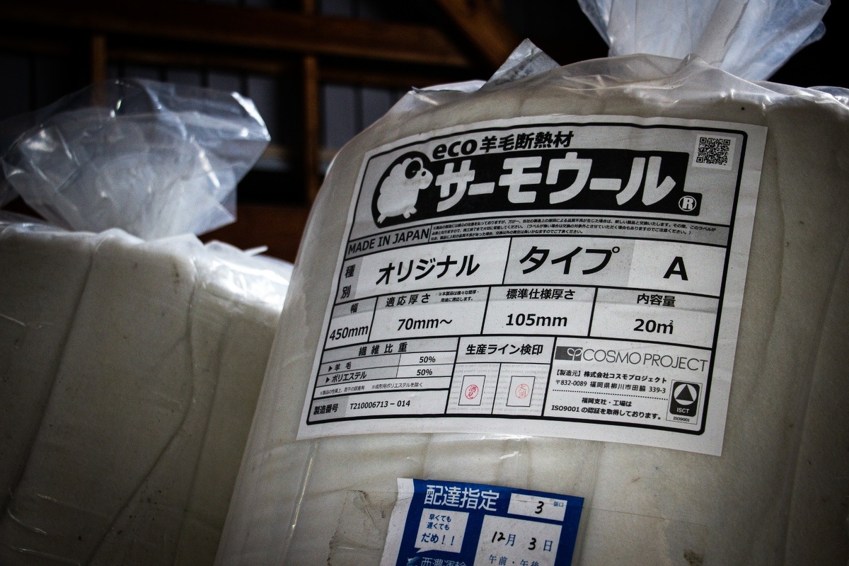 こちらのサーモウールは羊毛とポリエステルが5対5のものです。日本の気候に合うように改良された断熱材であり、特に湿気が多い雪国においてはいい仕事をしてくれる断熱材となっております。