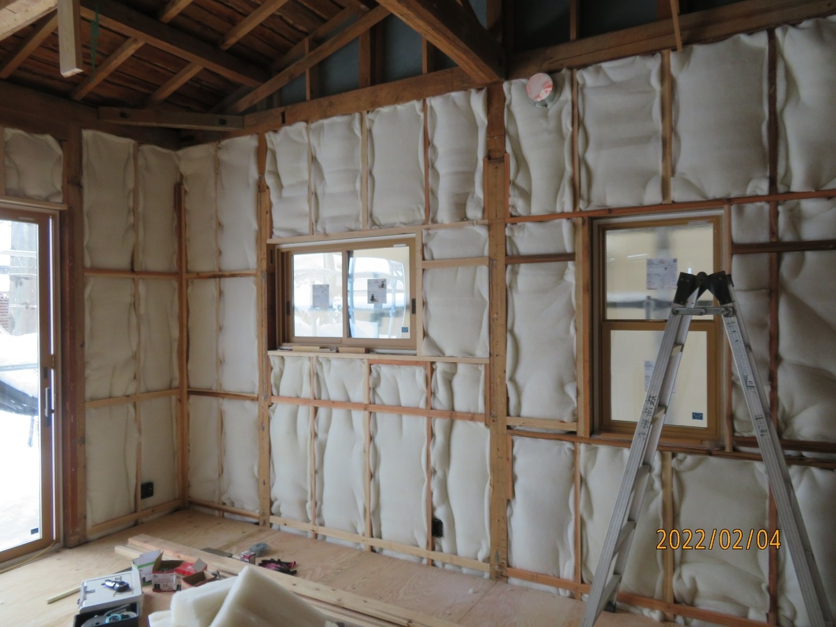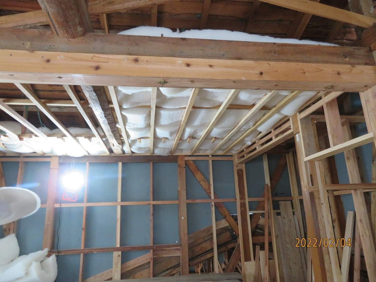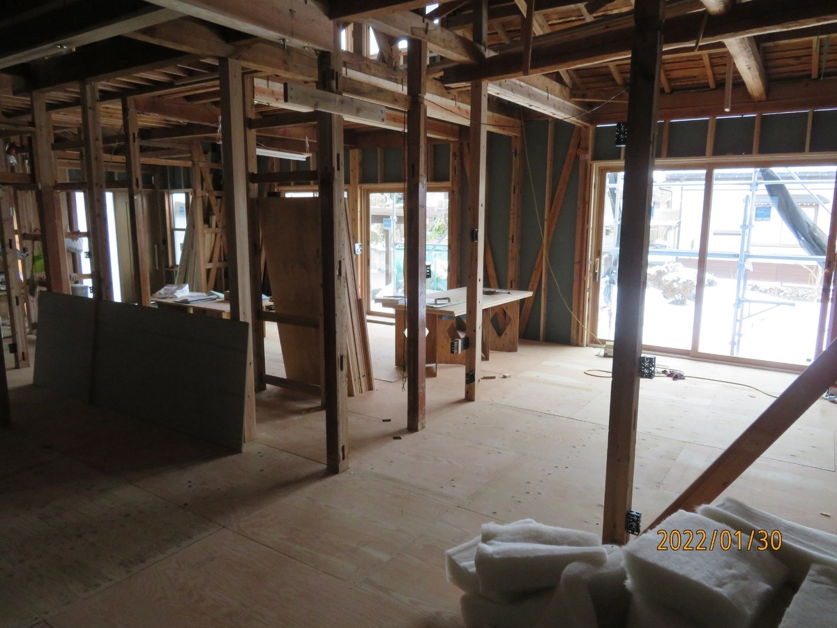 現在天井や、壁下地組に断熱材を入れる作業を進めております。