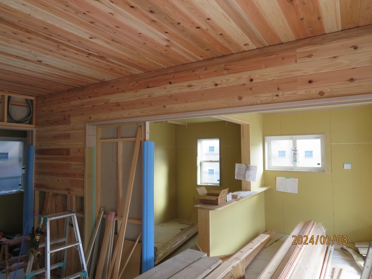 階段の取り付けを行い、天井と壁には杉板を張りました。