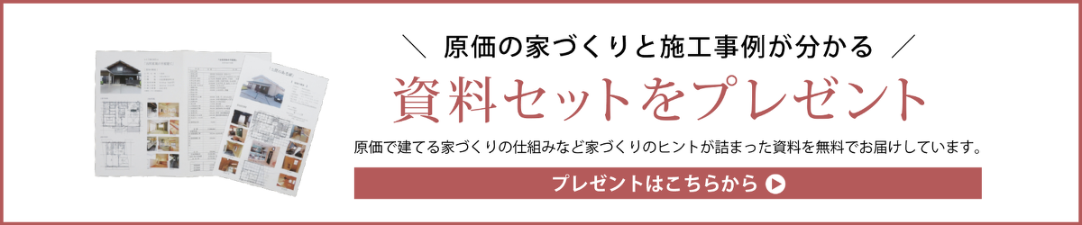 k-1工房では、会社案内や最新の家づくりにかかった原価資料に加え、「なぜ原価で家づくりができるのか?」を詳しくまとめた本をプレゼントしております。