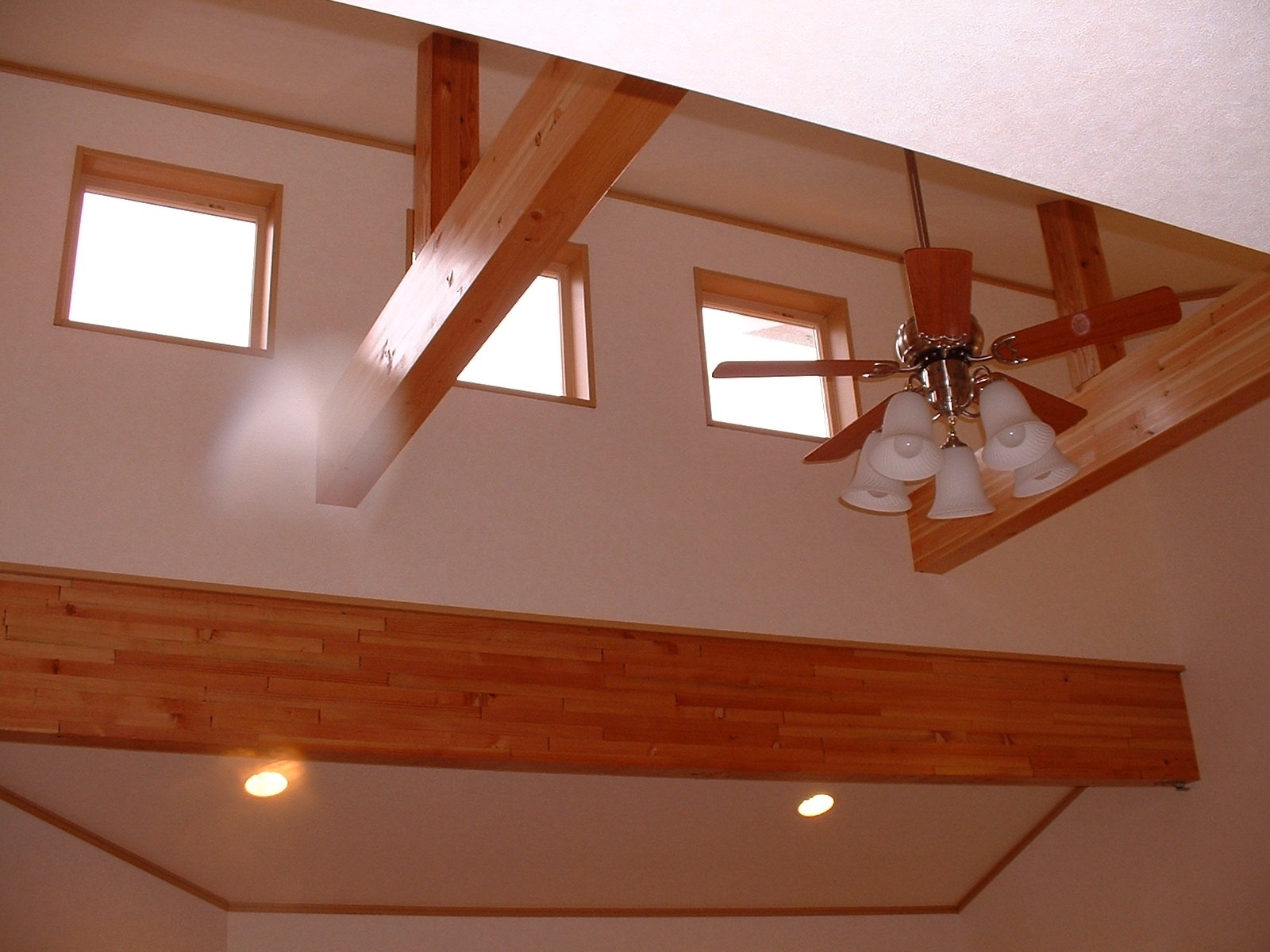 OS07 太陽を取り込む家 場所 新潟市 完成 平成15年12月 工事原価 1,335万円 延床面積 49坪 施工面積 57坪 工法 木造在来工法2階建 リビング リビングは梁をあらわした大きな吹き抜けとなっていて、たくさんの光が差し込みます。 ロフト すべての子供室にはロフトを付けました。 キッチン キッチンには奥様のこだわりで、フルオープン型の対面キッチンです。料理をしながら常に家族との会話を楽しめます。
