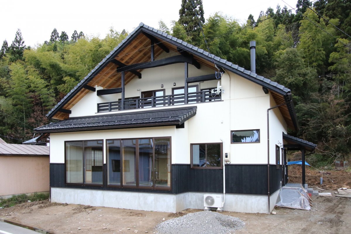 OS53 大屋根の家 場所 五泉市 完成 平成28年12月 工事原価 2,364万円 延床面積 56.00坪 施工面積 64.50坪 工法 木造2階建在来工法 外観 大屋根 玄関戸 玄関 玄関ホール 陽側 玄関吹抜 ランマ ダイニング リビング キッチン 食器棚 薪ストーブ 和室① 和室② 和室③ 和室④ 広縁 寝室 2階吹抜 2階ホール 物入 寝室② 子供室① 子供室② 物入② バルコニー バルコニーの梁① バルコニーの梁② 外収納 トイレ 手すり