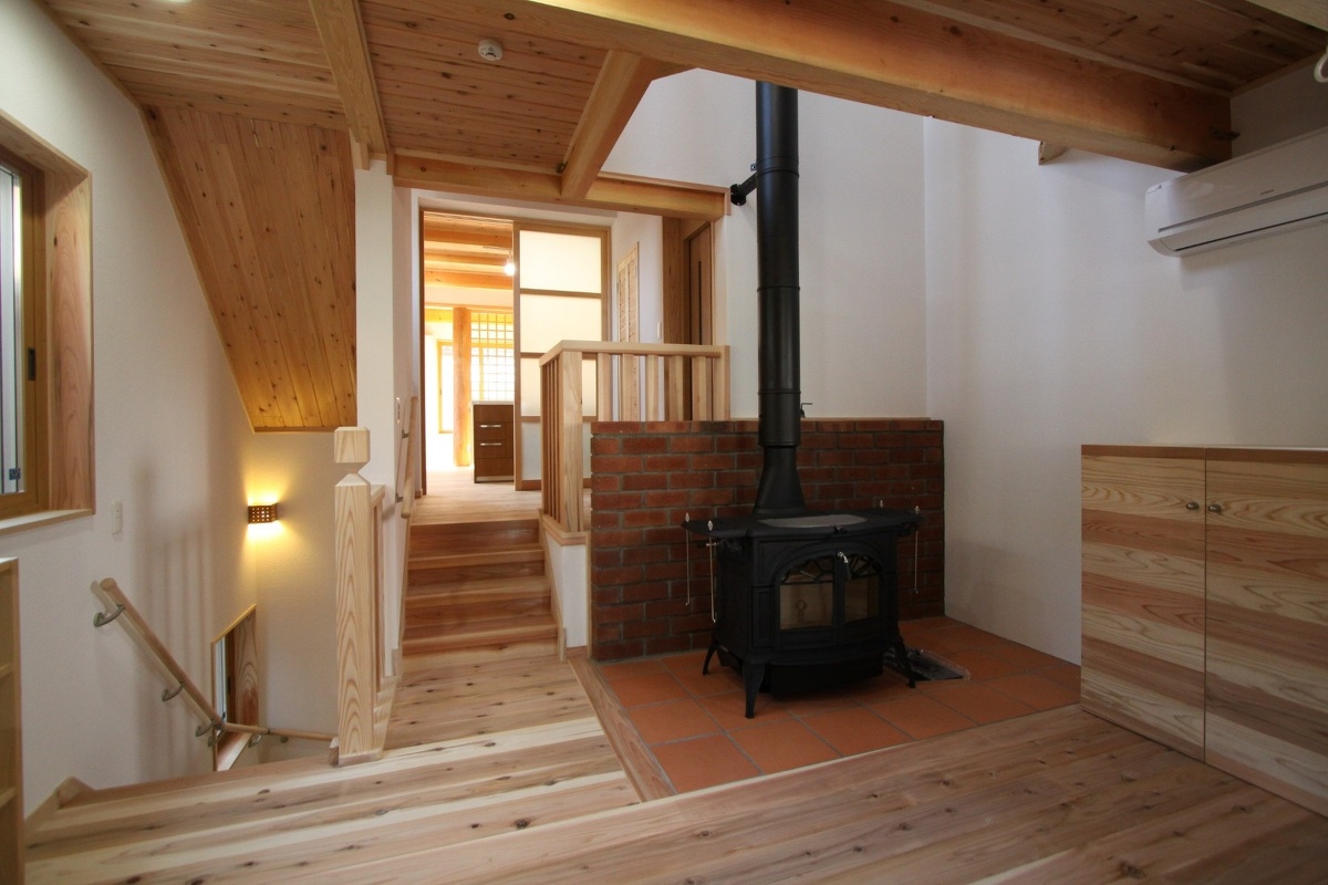 OS33 スキップフロアの3階建 「大花火の見える家」 場所 長岡市 完成 平成23年11月 工事原価 2,204万円 延床面積 56.53坪 施工面積 66.94坪 工法 木造在来工法3階建 外観 ポーチ 玄関1 玄関2 1F ダイニングキッチン 1F 和室 仏間 1F 和室からDK トイレ 1F~M2F階段 エレベーター M2F 風呂 M2F~2F階段 2Fダイニングキッチン 2Fキッチン 2F和室 2階和室からDK1 和室作り戸 寝室 M2Fから子供室 子供室 屋上へ階段 屋上バルコニー 薪ストーブ1 薪ストーブ2 作り付棚 玄関収納 床下収納 手すり